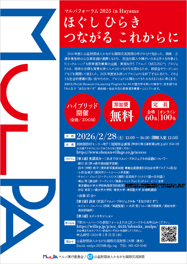 2016年度に公益財団法⼈かながわ国際交流財団の呼びかけで始まった、湘南・三浦半島地域の公⽴美術館が連携しながら、定住外国⼈や障がいのある⽅々を対象としたインクルーシブな教育普及事業の企画・実施を⾏う「マルパ(MULPA)※」プロジェクトは、地域の多様な背景を持つ⼈々とのつながりを深めるため、研修会やワークショップなどを展開してきました。2025年度末を持ってプロジェクトを終了するにあたり、どのような社会的意義が⾒い出せたのか、プロジェクトに関わってきた皆様とともに考えます。