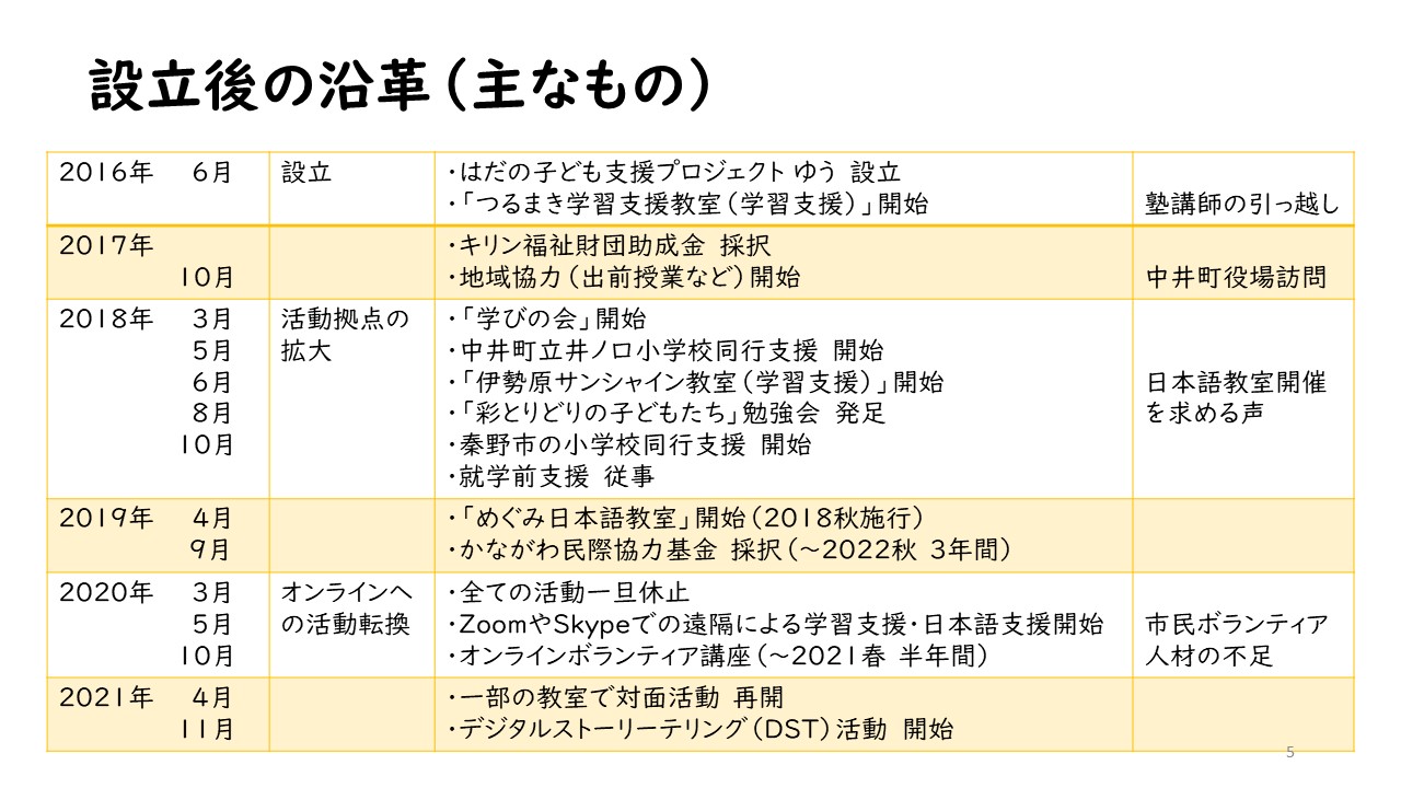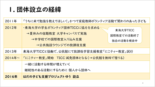 団体設立の経緯については、上智大学職員として子どもたちの学習支援をされていた三田村さんが、東海大学の学生ボランティア団体TICCと共に「外国ルーツの子どもたちの学習支援活動」を始めたことがきっかけのようですね。