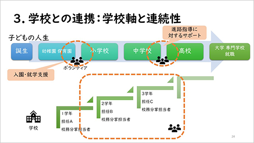 次の5つからなります。「放課後学習支援」「学校同行支援」「保護者支援」「地域協力」「啓発、養成活動」です(画像参照)。活動内容が多岐にわたっていますが、参加された方がバラバラになっていてはまったく意味がないので、一緒に活動することの想いや、それに加えて外部とのつながりもとても重要だと考えています。