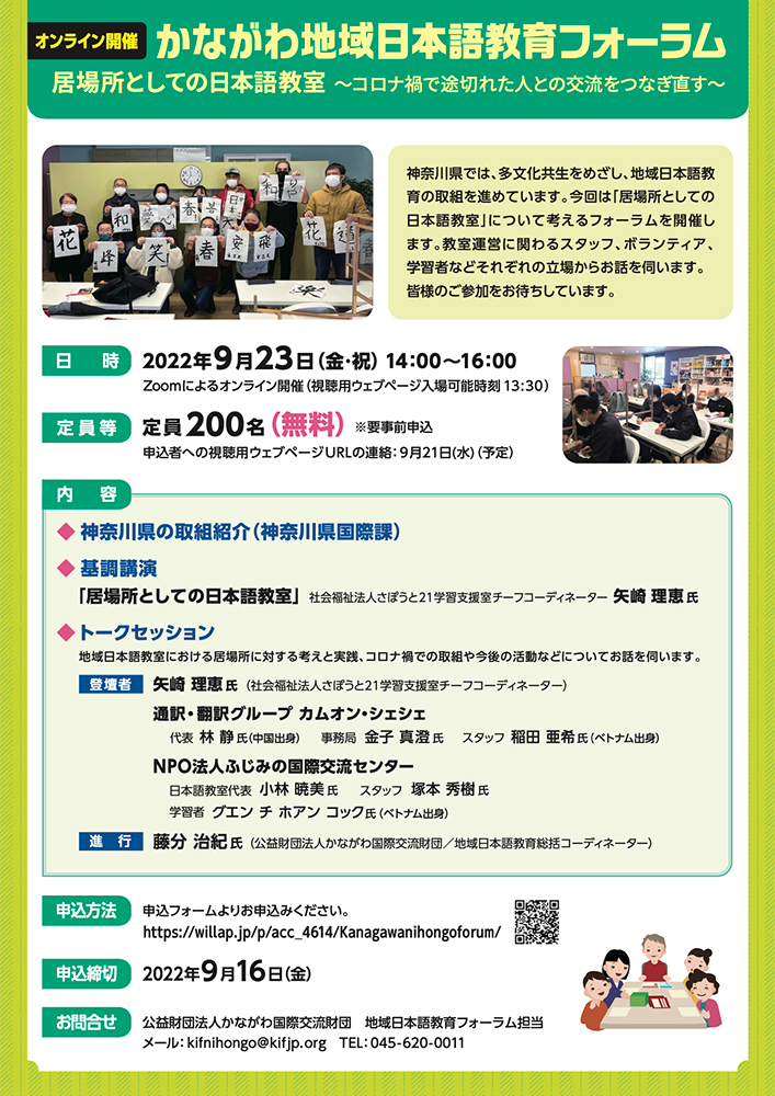 - (神奈川県内外の地域日本語教室ボランティアの方、日本語学校教職員、自治体、国際交流協会、NGO・NPO職員など)